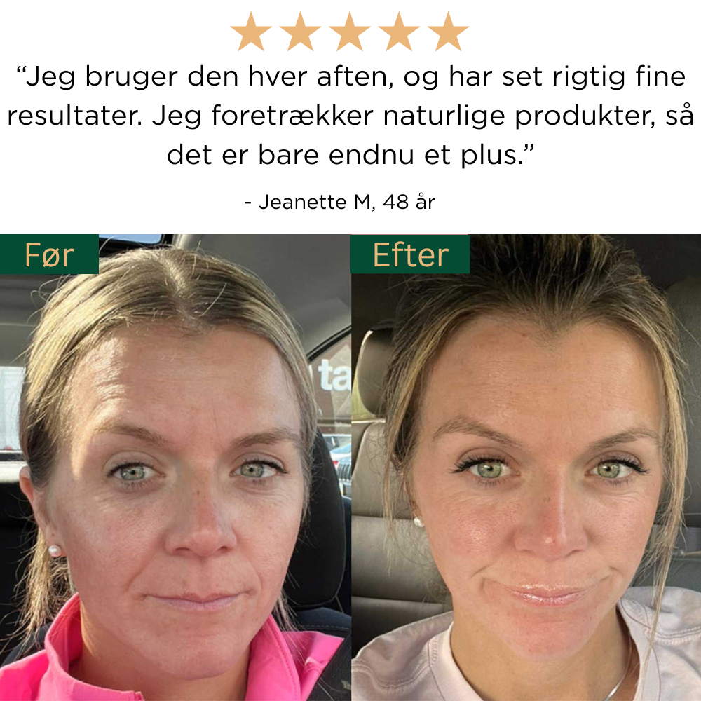 Interessant nok er det, mange af vores kunder først bemærker, færre mørke rander under øjnene og fine linjer. Nogle oplever det efter blot 7 dage.