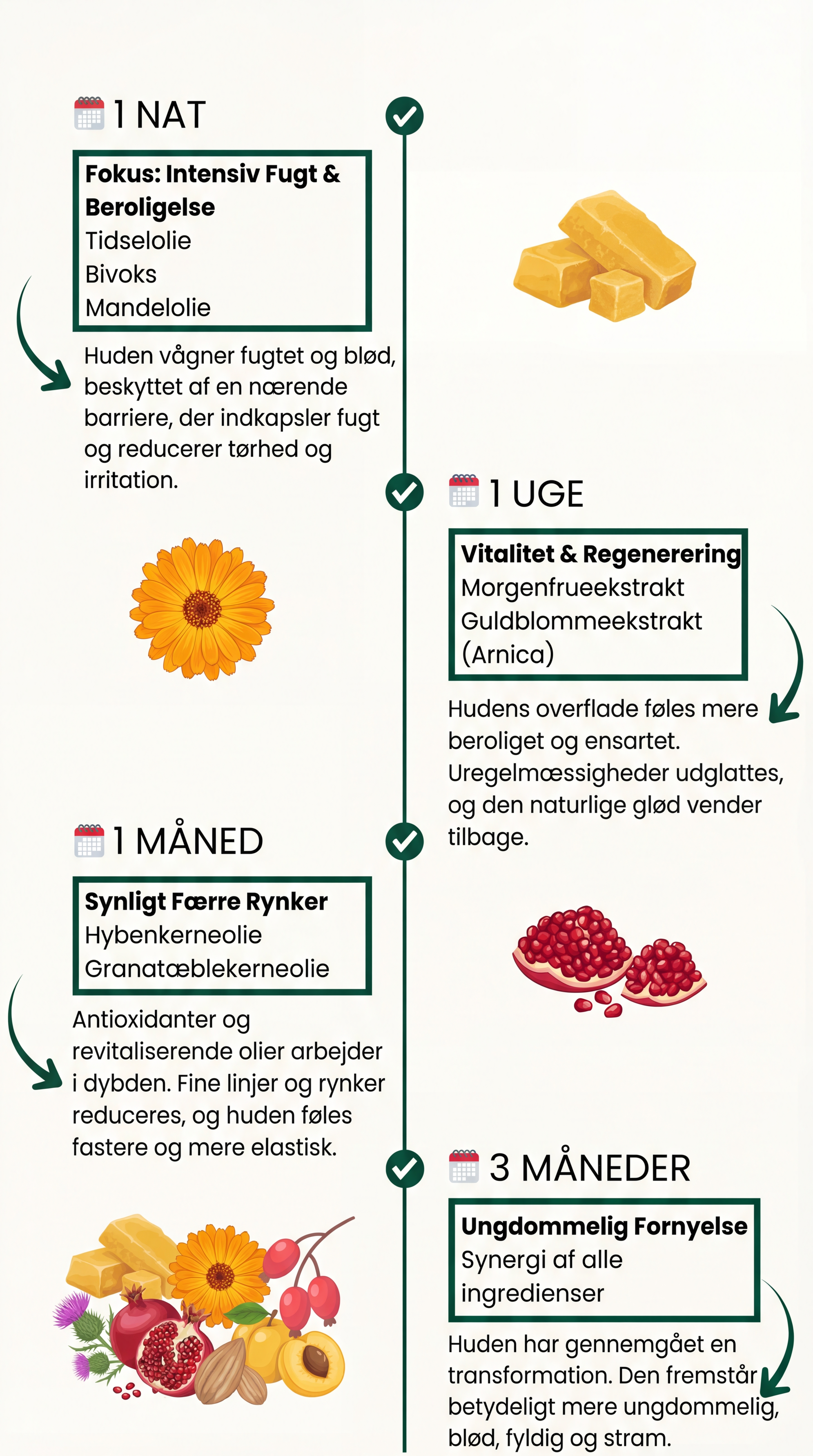 Ingredienser: Tidselolie, Bivoks, Hybenkerneolie, Morgenfrue-ekstrakt, mandelolie, Guldblomme-ekstrakt, Granatæblekerneolie, Squalane, Rosmarin-ekstrakt, E-vitamin, Hybenekstrakt, Solsikkeolie, Tranebærfrøolie, Havtorn-ekstrakt, Granatæbleekstrakt, Kamilleolie